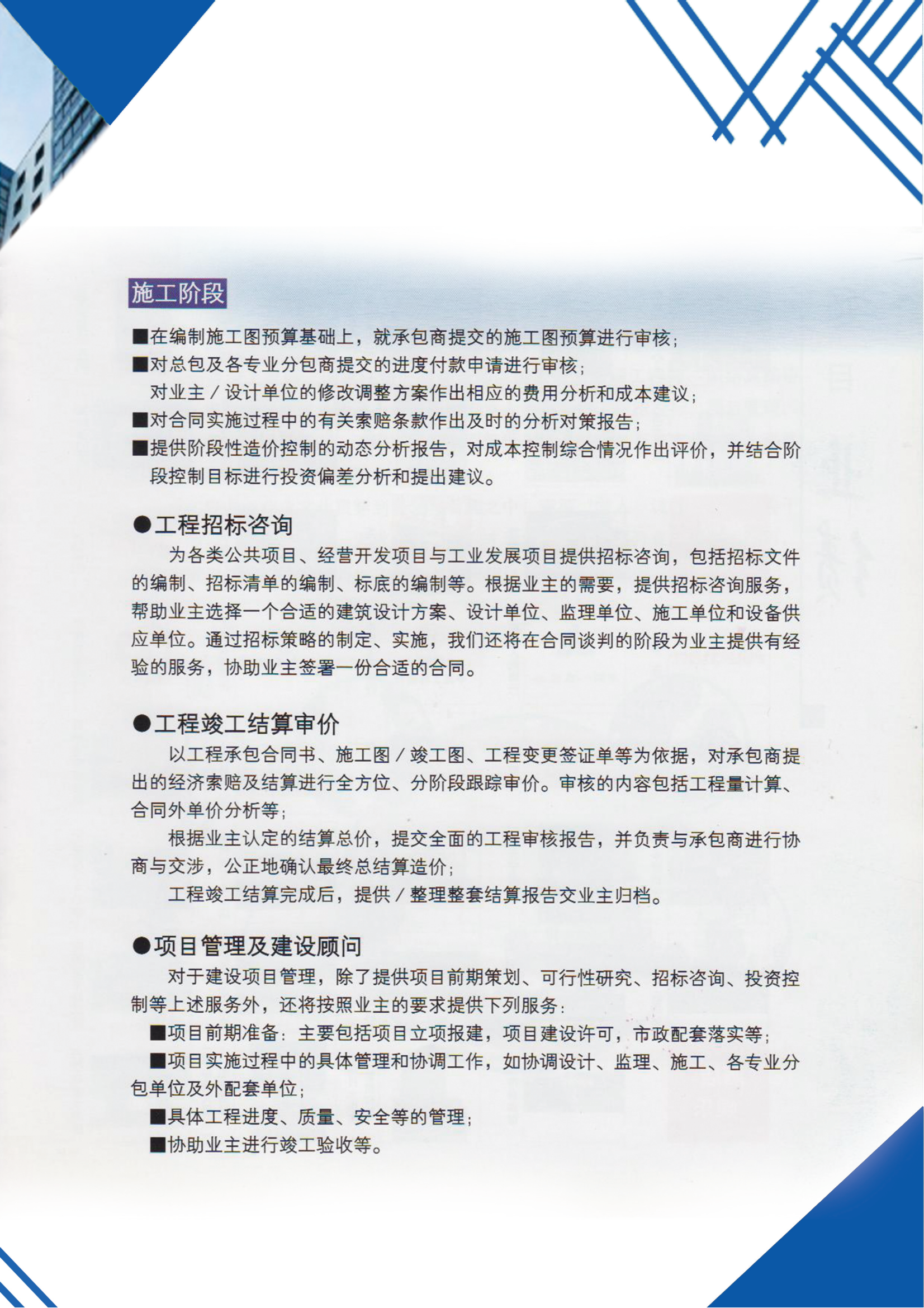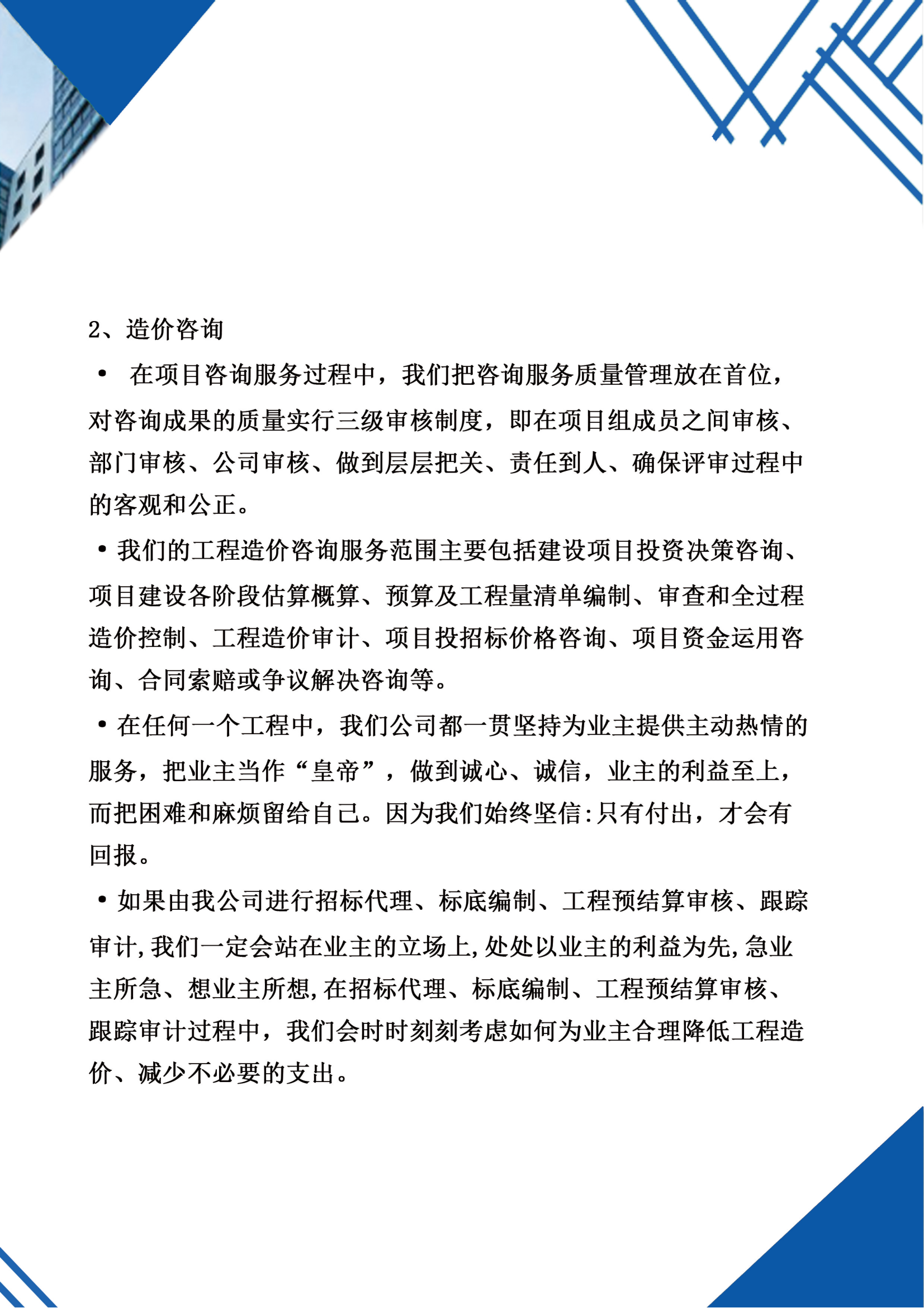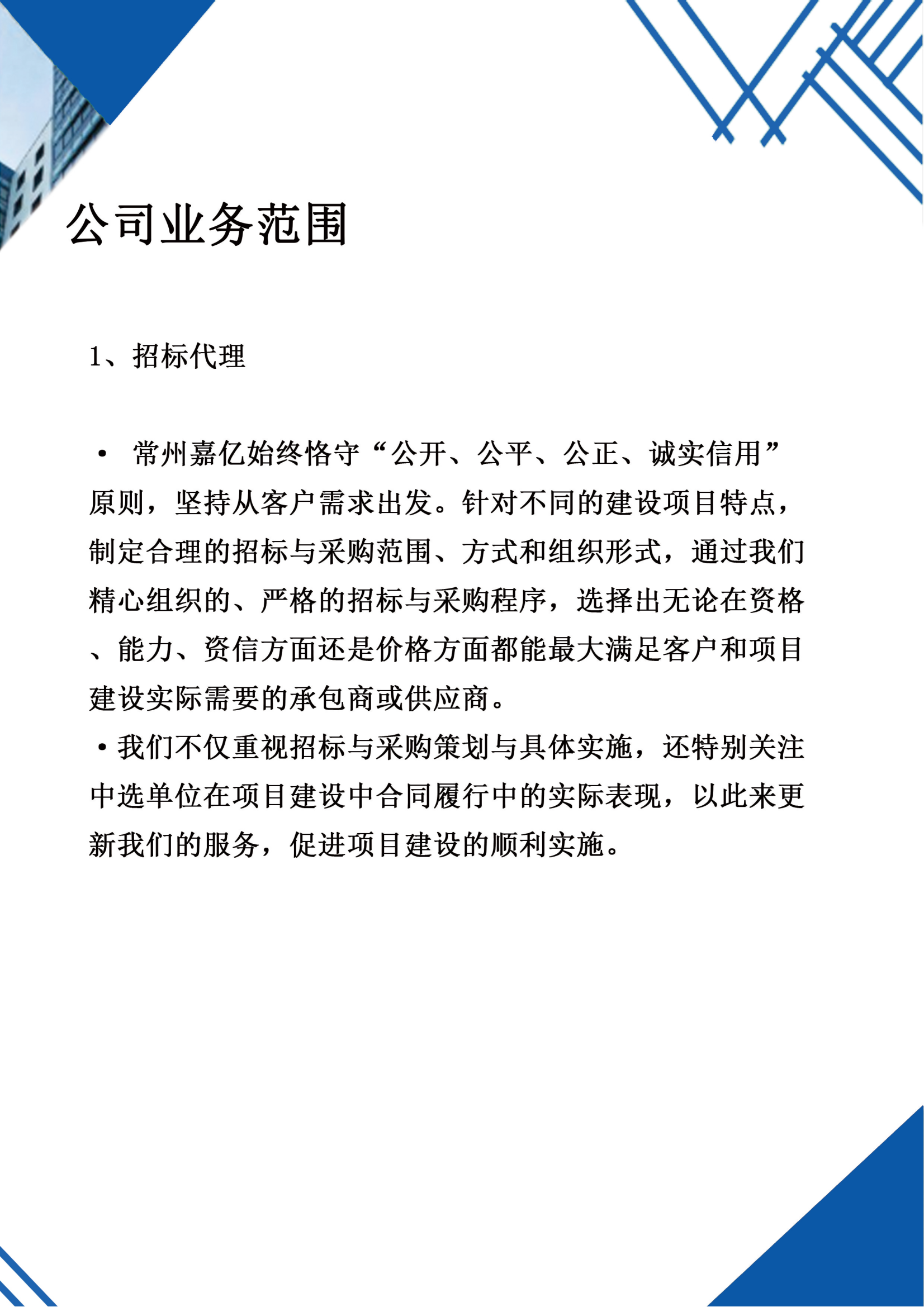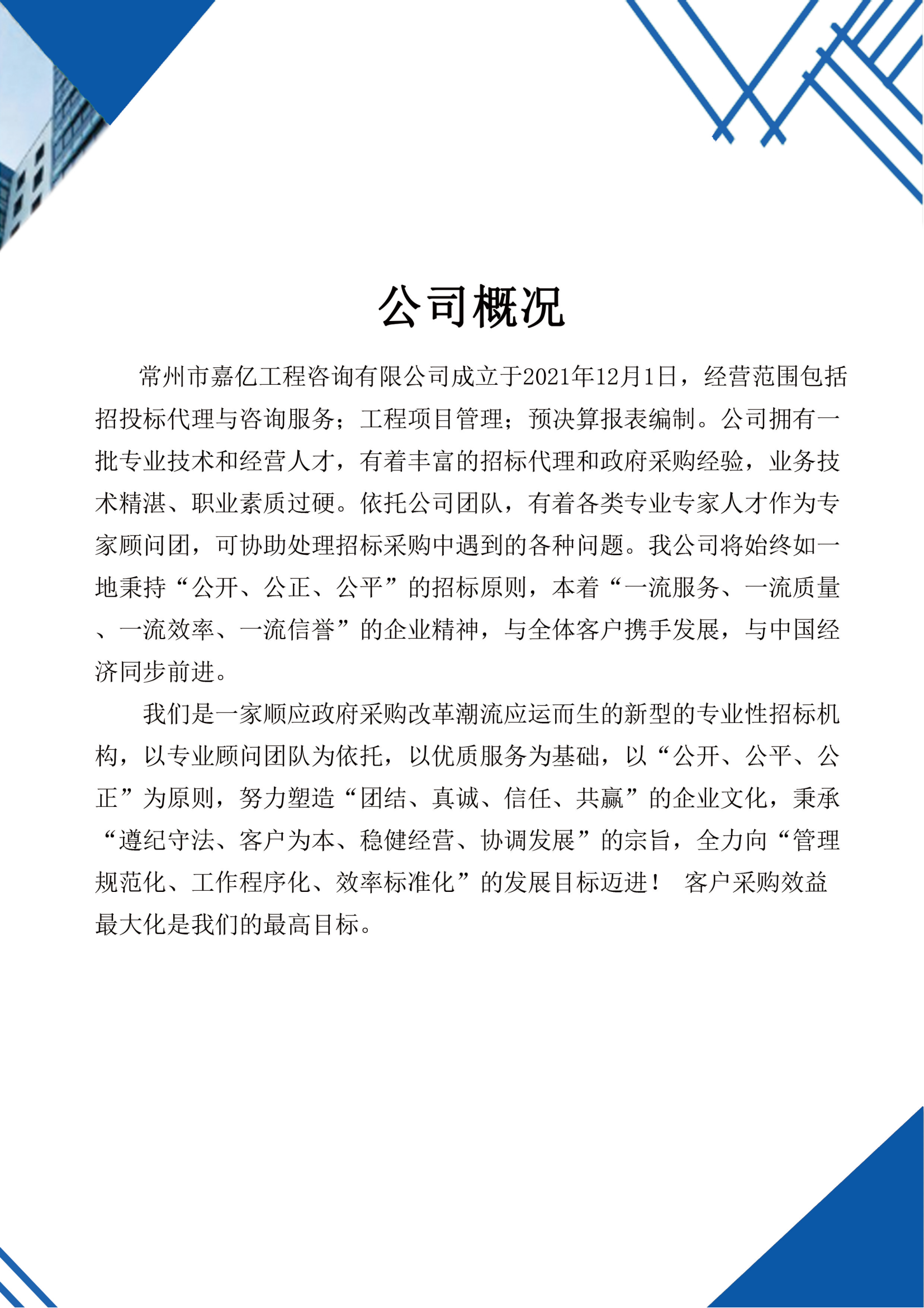 常州市嘉亿工程咨询有限公司成立于2021年12月1日,经营范围包括招投标代理与咨询服务;工程项目管理;预决算报表编制。公司拥有一批专业技术和经营人才,有着丰富的招标代理和政府采购经验,业务技术精湛、职业素质过硬。依托公司团队,有着各类专业专家人才作为专家顾问团,可协助处理招标采购中遇到的各种问题。我公司将始终如一地秉持“公开、公正、公平”的招标原则,本着“一流服务、一流质量、一流效率、一流信誉”的企业精神,与全体客户携手发展,与中国经济同步前进。 我们是一家顺应政府采购改革潮流应运而生的新型的专业性招标机构,以专业顾问团队为依托,以优质服务为基础,以“公开、公平、公正”为原则,努力塑造“团结、真诚、信任、共赢”的企业文化,秉承“遵纪守法、客户为本、稳健经营、协调发展”的宗旨,全力向“管理规范化、工作程序化、效率标准化”的发展目标迈进! 客户采购效益最大化是我们的最高目标。